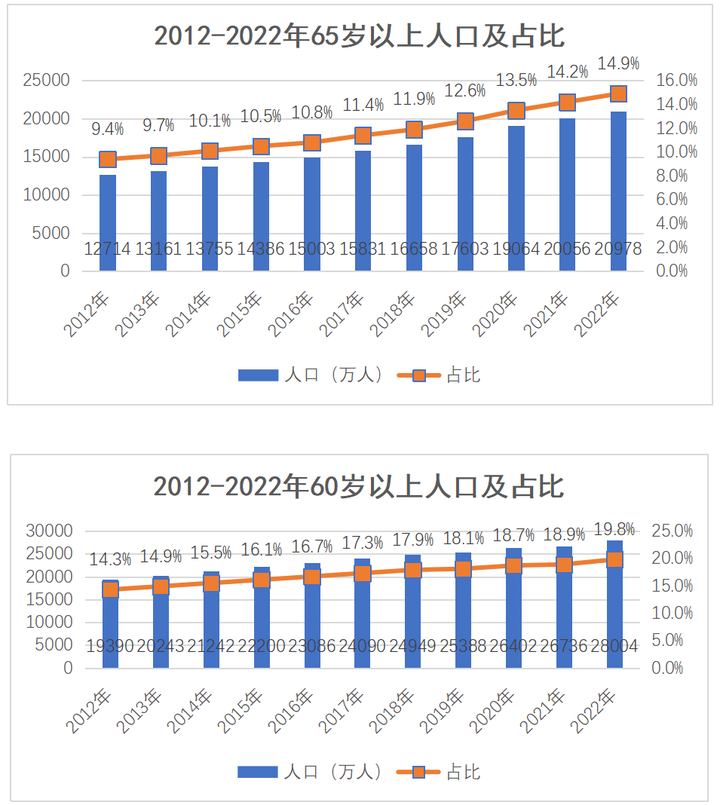 10月23日,是我们国家的传统节日重阳节,这一天也在1989年被我国政府正式定为“中国老人节”, 按照我国将60岁及以上人群定义为老年人的标准来看,我国老年人的占比已经达到了20%。根据国家统计局2022年度统计公报数据显示,我国2022年末65岁以上的老年人占比已经达到了14.9%,60岁以上的老年人占比达到了19.8%,较10年前均高出了5.5个百分点。