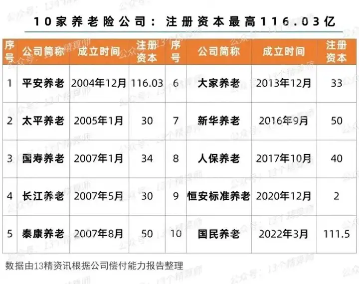 2004年12月,自首批专业养老保险公司被批准成立,经过近二十年的发展,截至目前,全国共有10家专业养老险公司,截至2023年2季度末,10家养老险公司的总资产达到2500亿元。