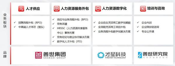 凭借快响应、高素质、强专业的团队,善世围绕人才“选、育、用、留”的人力资源管理全生命周期,为客户提供人力资源服务外包、招聘流程外包、中高端人才寻访、全流程业务外包、数字技术赋能的灵活用工、管理咨询与培训、产才融合等解决方案,积极承担推动人力资源高效配置、提升劳动者素质、促进就业创业和助力经济高质量发展的社会责任,达成“帮助人才、客户、产业更为成功”的集团使命。