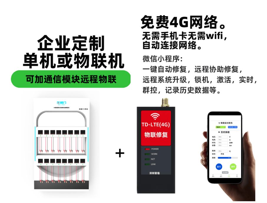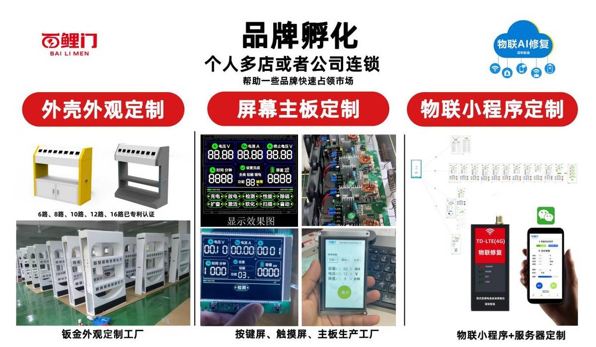 更具革命性的是,在2024 年技术方案中,百鲤门是行业第一个率先将单机修复机升级为物联网智能机,通过自主研发的百鲤 OS 系统软件,实现了 "小程序 + 电池自动修复 + 远程操控" 的智能闭环。这套系统改变了传统单机的执行方式,所有操作指令都在云端服务器上运行,创业者可通过手机、平板等设备随时随地进行远程操控。这种 "大数据云端修复" 模式,将原本需要专业技师才能完成的复杂操作,简化为一键式自动修复,极大降低了技术门槛。