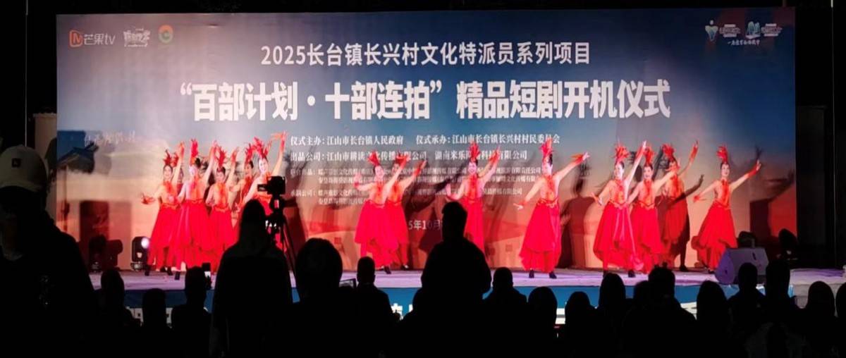 江山市耕读文化传播中心隆重推出“精品短剧百部计划” 十部连拍短剧开机仪式.锣鼓喧天,歌飞舞翩,光影闪耀,红毯铺展。10月由江山市长台镇人民政府主办、江山市长台镇长兴村委员会承办的长台镇长兴村文化特派员系列项目“百部计划·十部连拍”短剧开机仪式,在长兴村文化礼堂(广场)隆重举行。