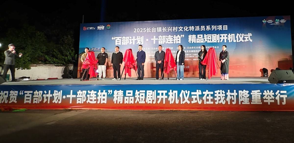 在热烈的氛围中,江山市文旅局党组书记毛振荣、江山市宣传部副部长周林兴、文旅集团总经理郑铖、镇党委书记毛锋君、长兴村书记夏玉霞、项目投资出品方代表、江山市耕读文化传播有限公司董事长郑犁敏、导演徐明、短剧之王华子等共同为摄影机揭幕。
