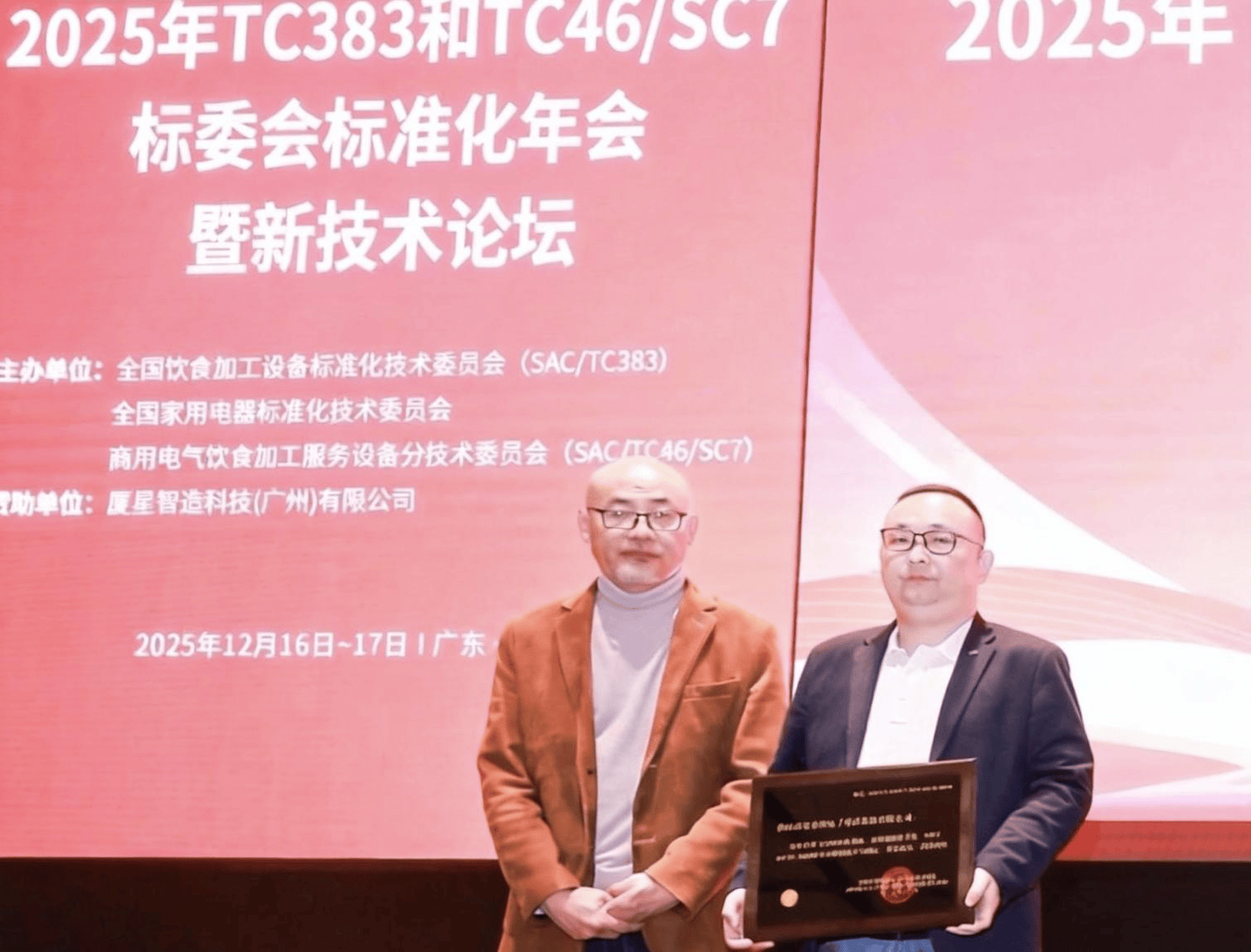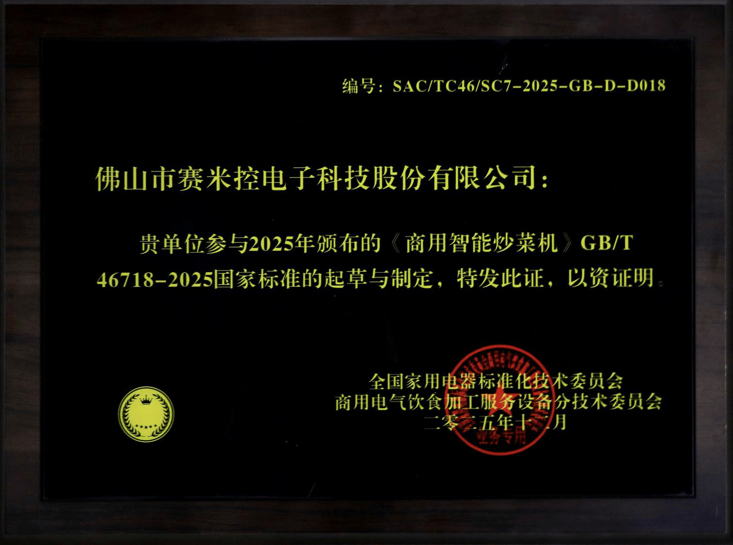 广州,2025年12月16日 在今日召开的2025年度TC383与TC46/SC7标委会标准化年会上,全国家用电器标准化技术委员会正式向佛山市赛米控电子科技股份有限公司等起草单位颁发《商用智能炒菜机》国家标准(GB/T 46718-2025)参编证书,标志着全球首个商用智能炒菜机中国标准完成编制进入实施准备阶段。
