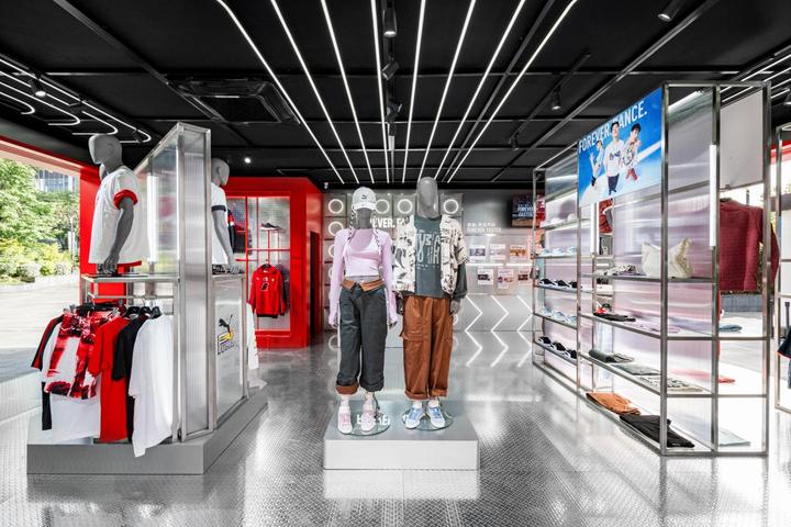 本次PUMA品牌快闪体验店坐落于被誉为“成都天然时尚秀场”的春熙路商圈。店铺外观采用现代前卫的设计和鲜明的色彩搭配,呈现出 PUMA“FOREVER. FASTER. ”品牌精神,带来极具速度感和科技感的强烈视觉冲击。整体设计融合构建出精妙的冲突、平衡与速度感,将PUMA品牌的先锋潮流属性展现的淋漓尽致。